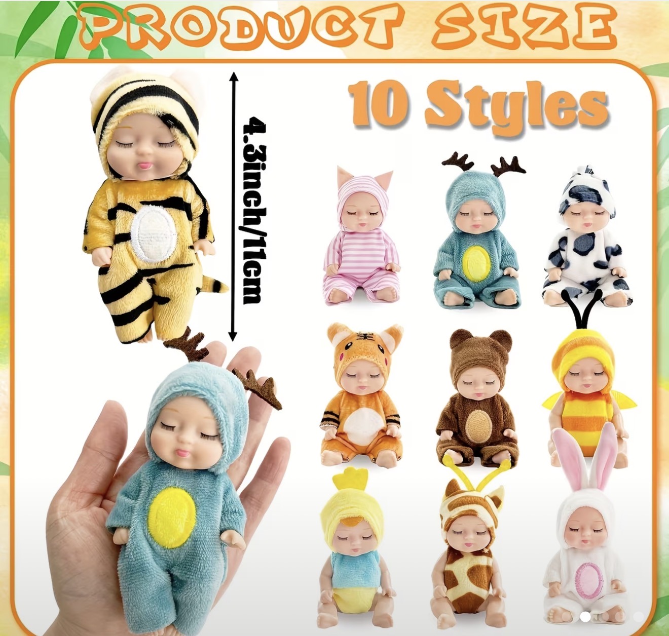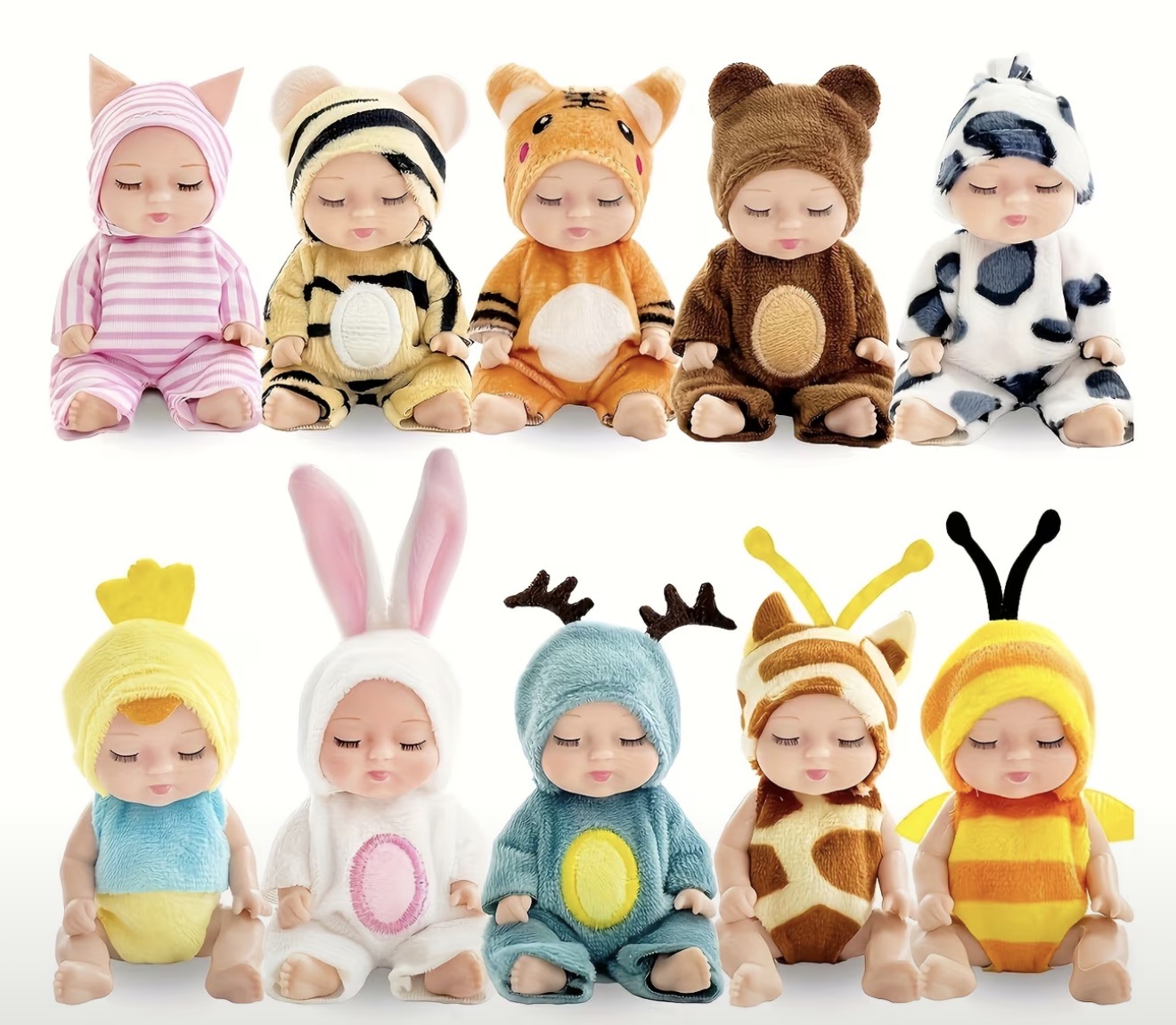 This product is a set of 10 mini children's dolls, each measuring 4 inches tall and featuring realistic animal costume designs. The dolls are made of polyvinyl chloride and come in a variety of animal themes such as bunny and duck. Each doll is designed in a vivid style and is suitable for ages ranging from 72 months to 5 years. This set is perfect for tabletop play activities and is targeted towards a unisex audience of children.