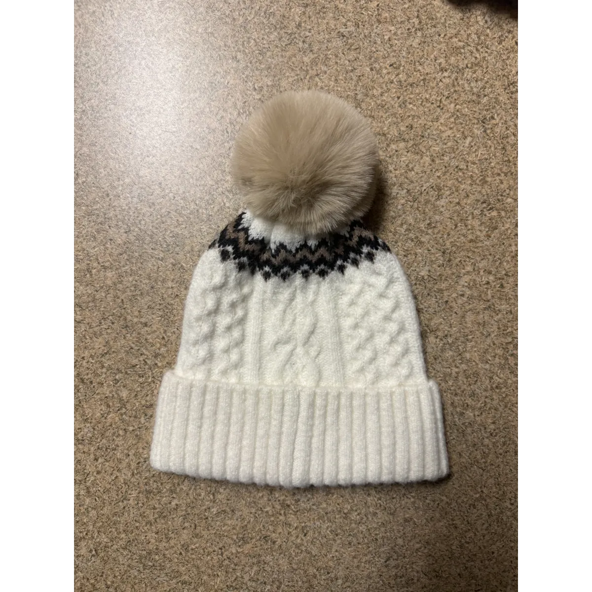 Anne Klein Ivory Cable Knit Faux Fur Pom Pom Warm Winter Beanie Hat Cap NWOT Anne Klein Ivory Cable Knit Faux Fur Pom Pom Warm Winter Beanie Hat Cap NWOT